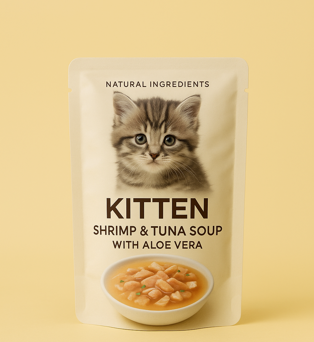 As a kitten expert, I highly recommend our Kitten shrimp and tuna soup with aloe vera. Our pack of 7 comes in small 50g portions, making it perfect for young kittens to eat. Packed with vitamins and minerals, this broth promotes healthy growth, ensuring your kittens thrive. Try it today for a happy and healthy kitten!